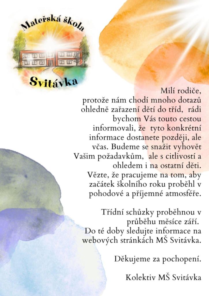 Navýšení kapacity MŠ – navýšili jsme kapacitu dvou tříd až do počtu 28 dětí. Díky tomu bude možné přijmout i děti, které při zápisu do MŠ nebyly přijaty. Dodatečné přijetí bude probíhat dle platných kritérií. Paní ředitelka nyní aktualizuje seznam, rodiče budou o výsledku včas informováni.