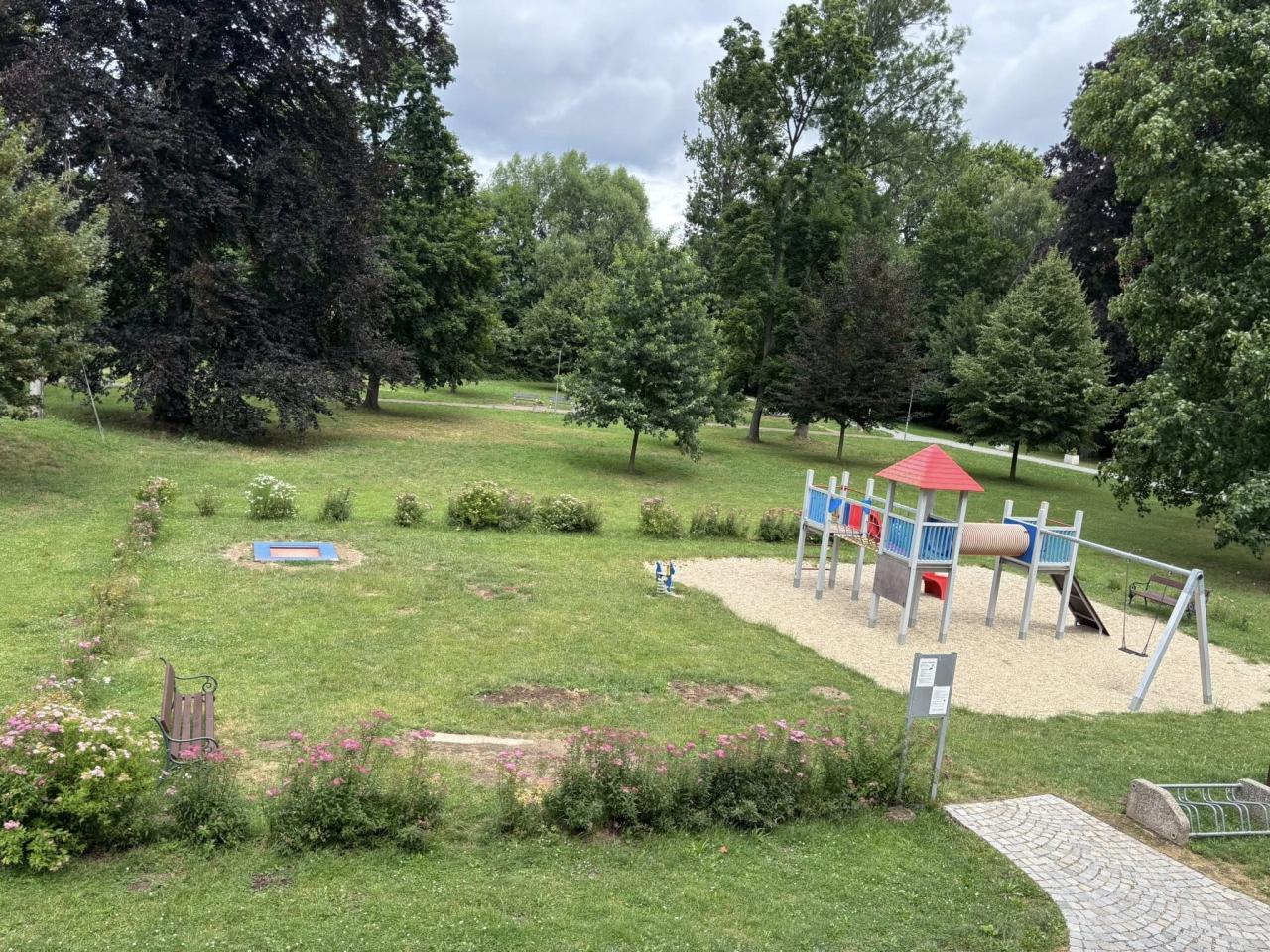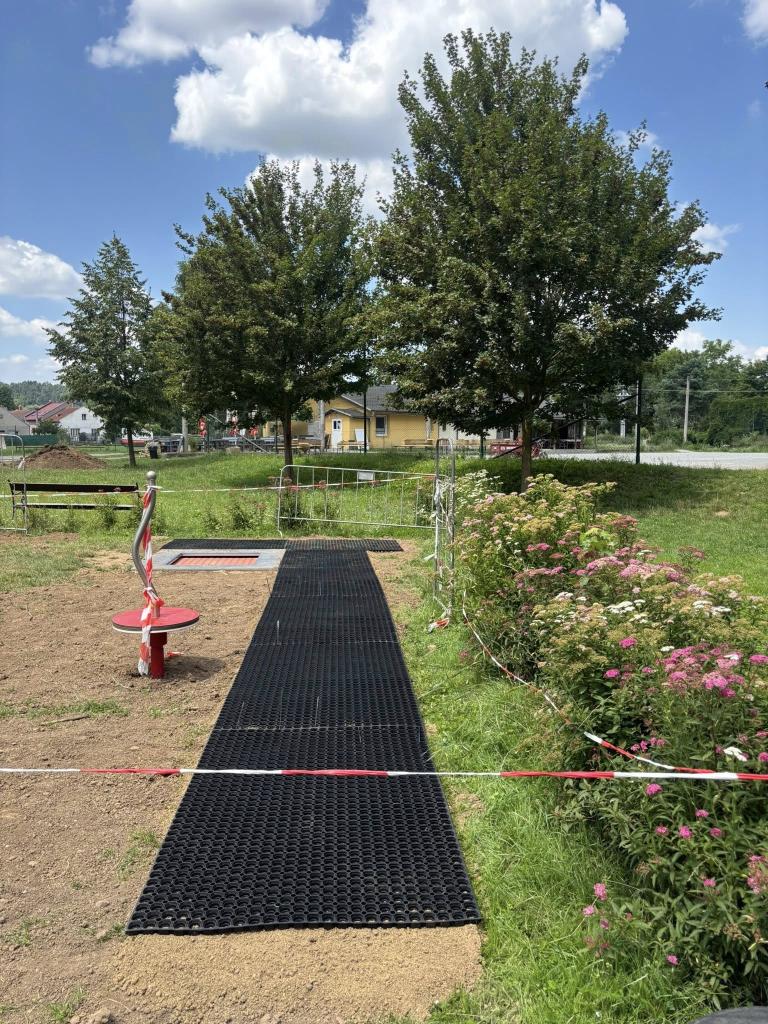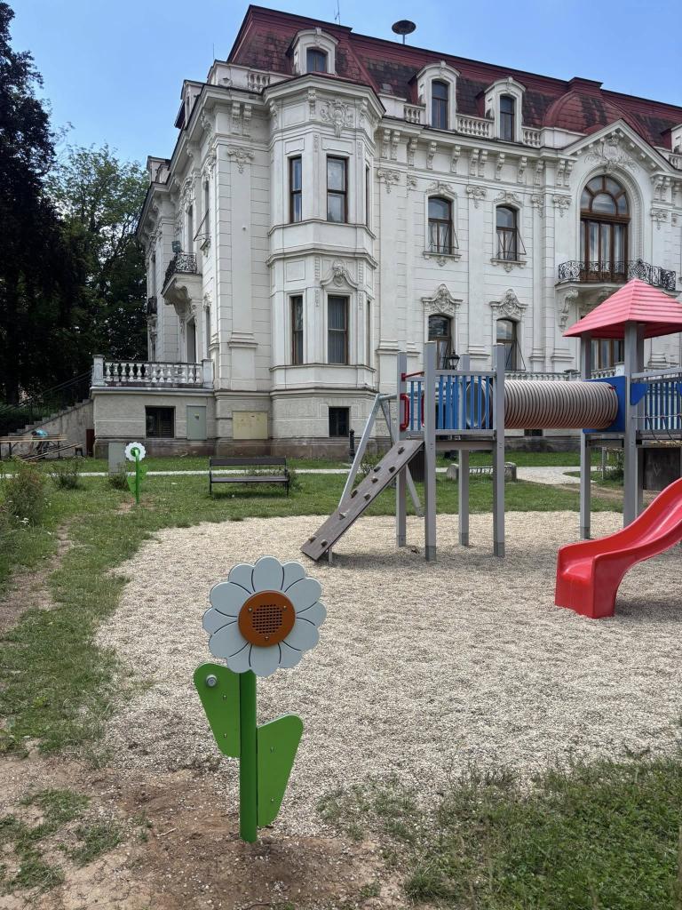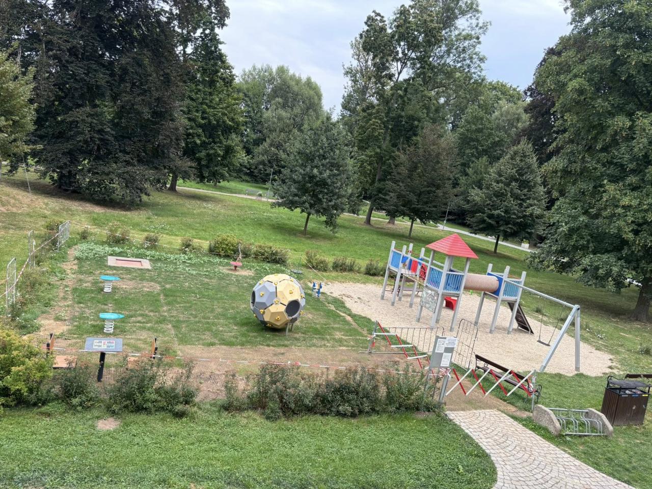 Polovina dětského hřiště v parku získala nový kabát. Staré herní prvky byly odstraněny a nahrazeny moderními – prolézací bublinou, houpadly, telefonem a stolečkem s hrou „Člověče, nezlob se“.
