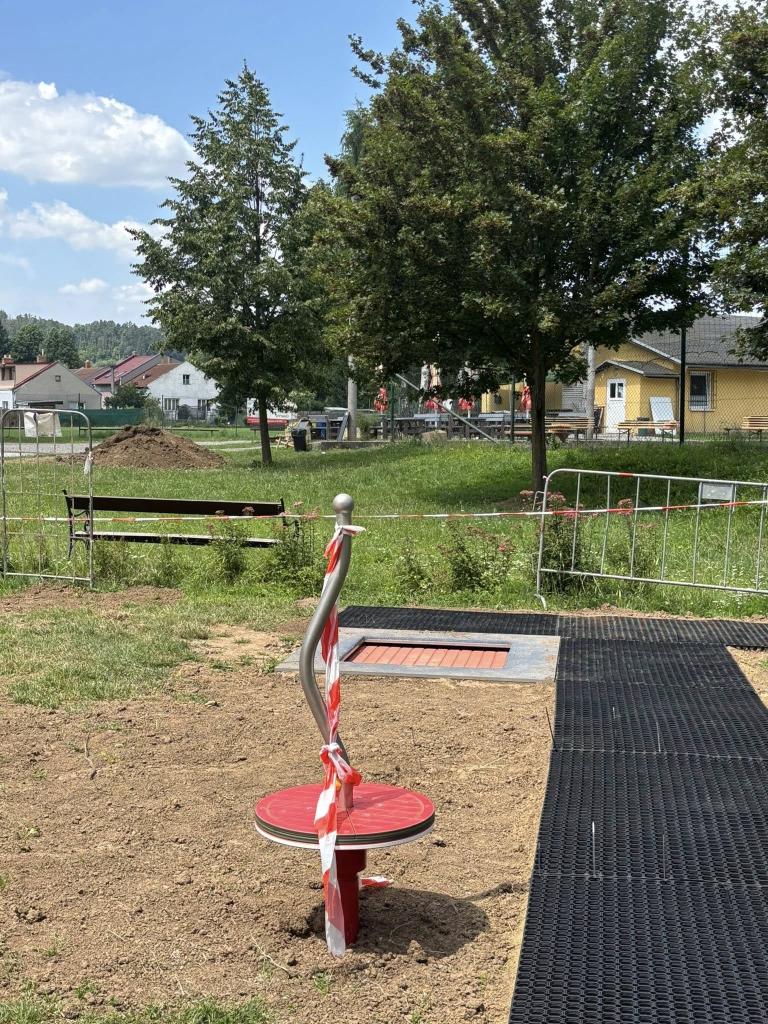Každý prvek musí mít dostatečný dopadový prostor, proto byla pod nimi instalována speciální dopadová plocha, kterou tvoří gumová podložka prorůstající trávou. Tento povrch je bezpečný, přirozeně zapadá do okolí a bude se pravidelně sekat stejně jako běžný trávník.