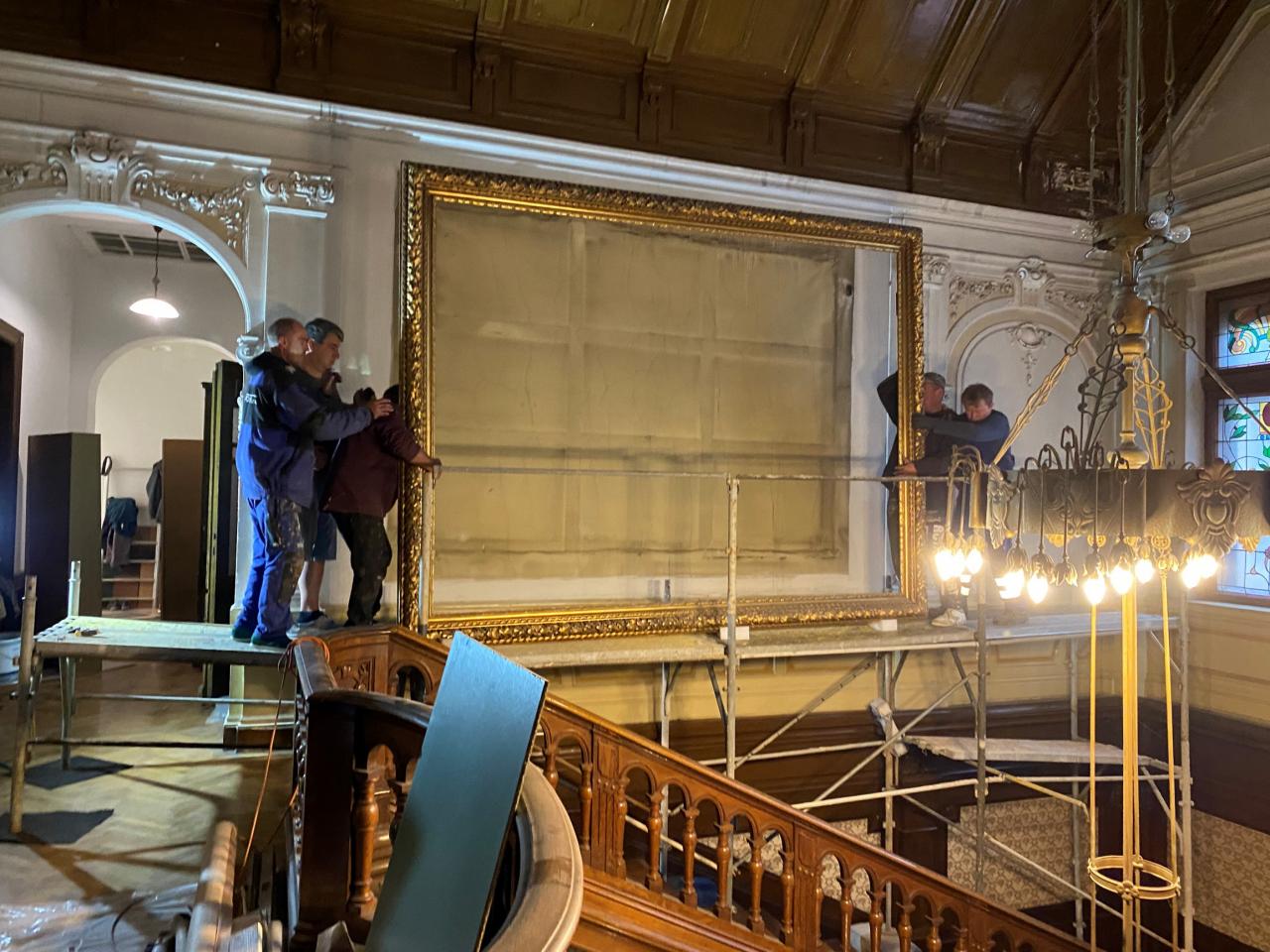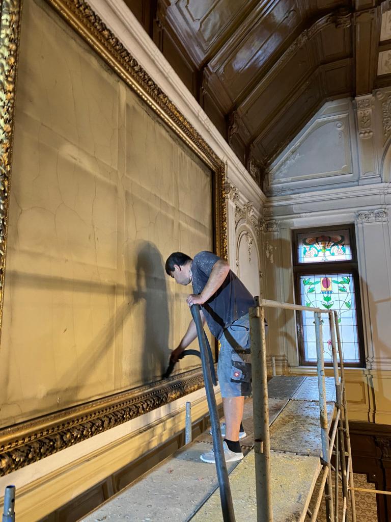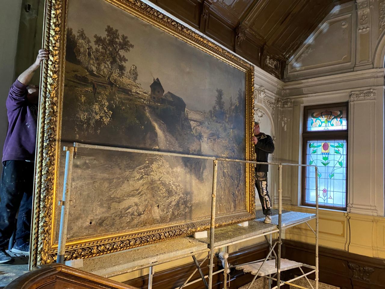 O víkendu byla zahájena dlouho očekávaná práce na opravě a restaurování velkého obrazu, který zdobí prostor haly Velké Löw- Beerovy vily.