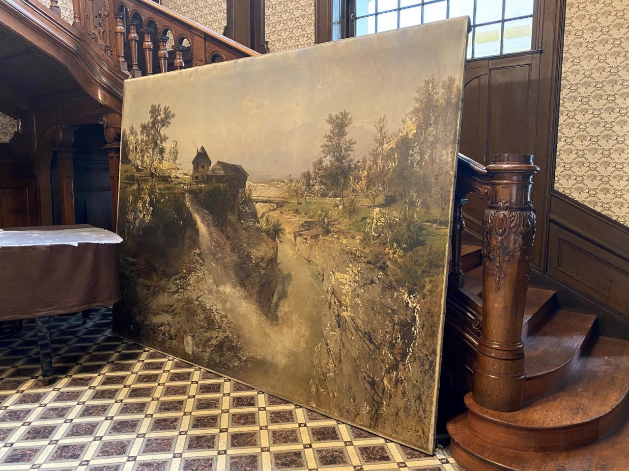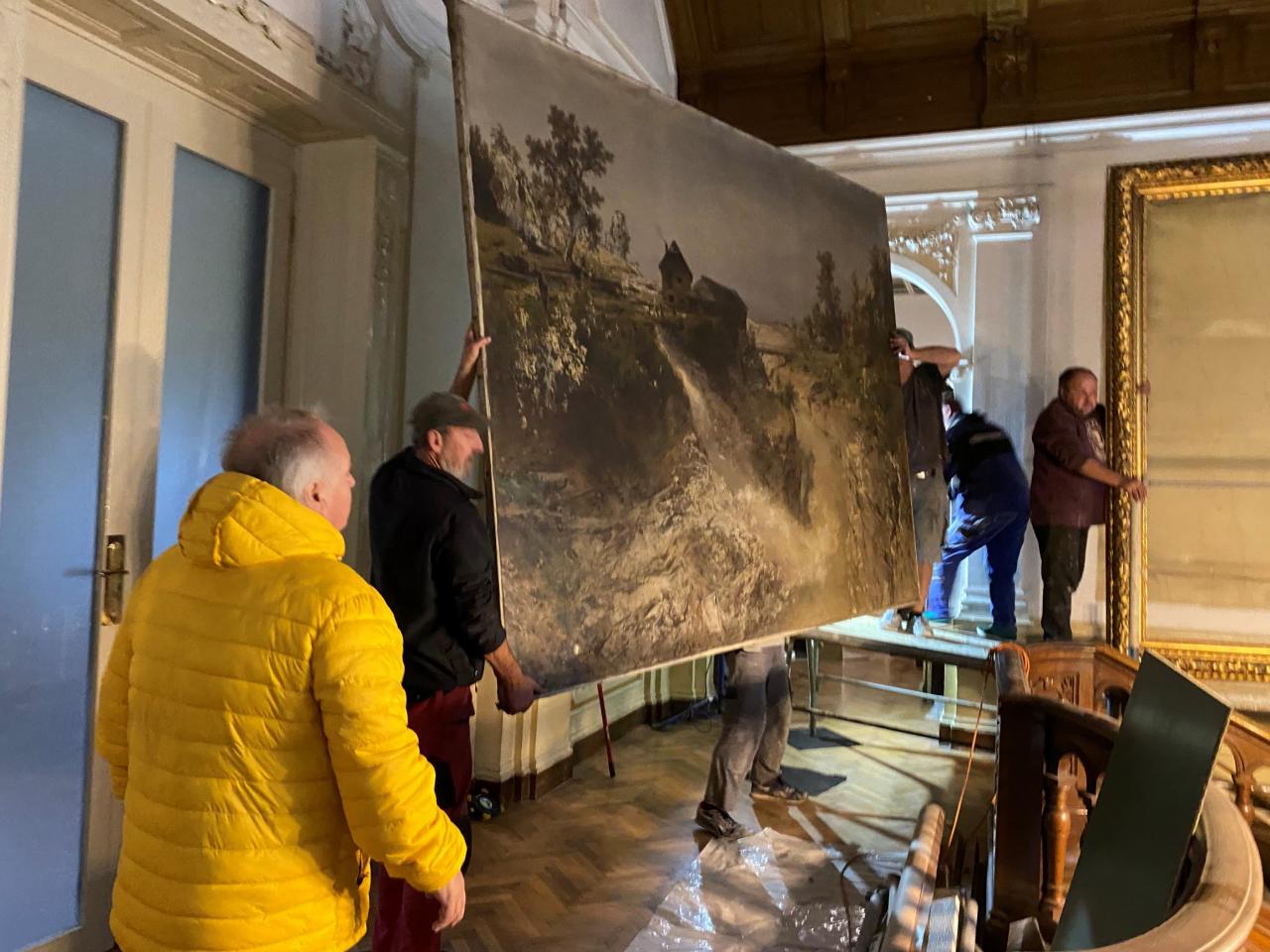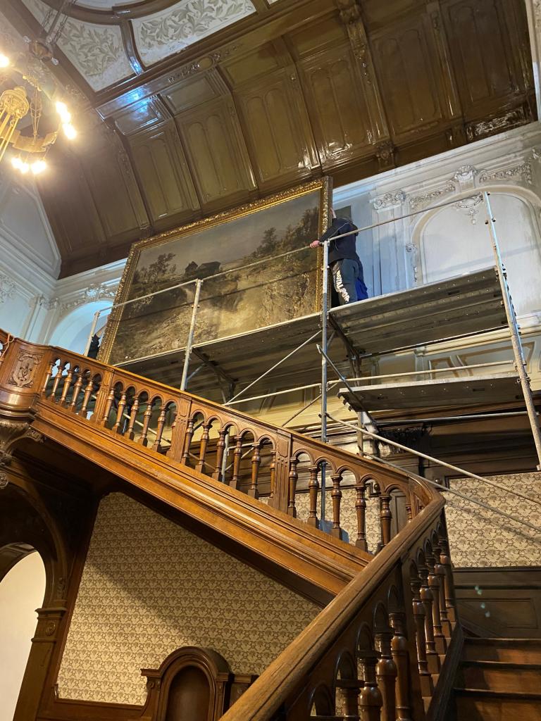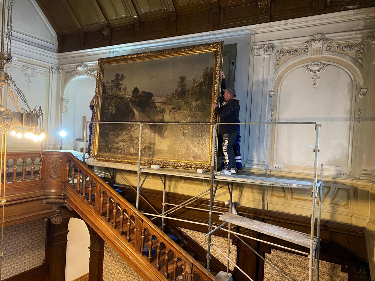 O víkendu byla zahájena dlouho očekávaná práce na opravě a restaurování velkého obrazu, který zdobí prostor haly Velké Löw- Beerovy vily.