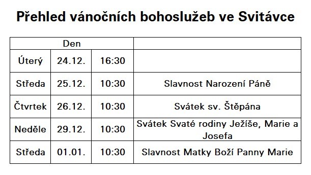 Přehled vánočních bohoslužeb v kostole ve Svitávce