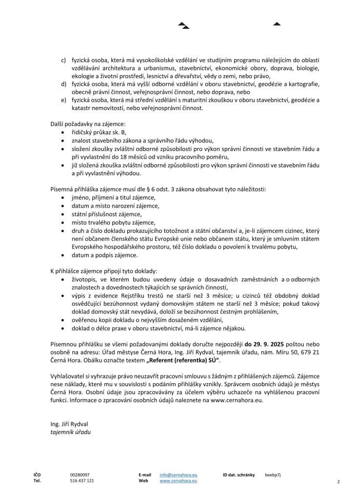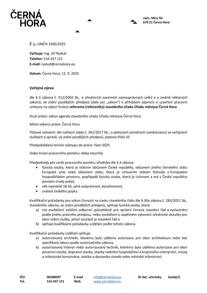 Veřejná výzva na pozici referenta stavebního úřadu v Černé Hoře