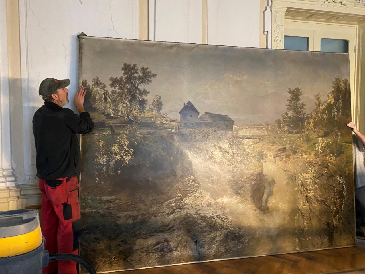 O víkendu byla zahájena dlouho očekávaná práce na opravě a restaurování velkého obrazu, který zdobí prostor haly Velké Löw- Beerovy vily.