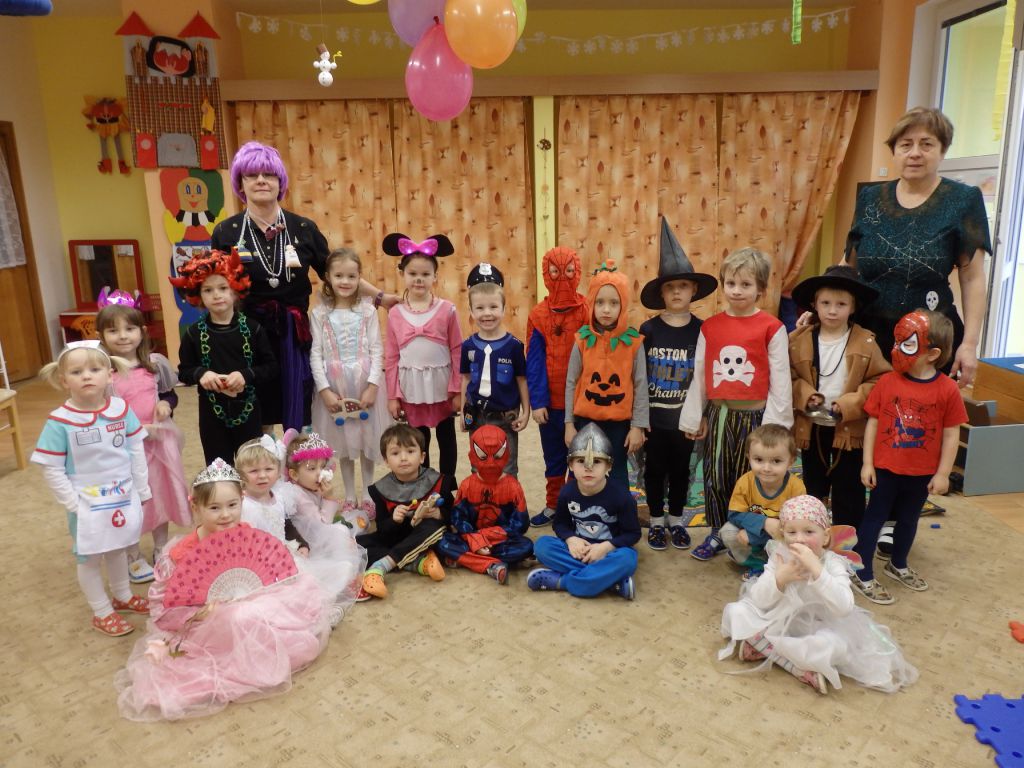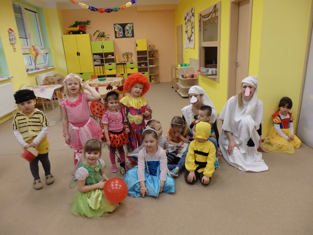 Na tento slavnostní den rodiče dětem připravili velmi pěkné a působivé masky, snažili se dětem splnit jejich přání. Děti se v maskách vzájemně představovaly, tančily při hudbě, vžily se do pohádkových postav a byly šťastné. Paní učitelky byly „hodné čarodějnice“ – léčitelky, které naučily děti pít „lektvárek“ – zdravou vodu s citrónem. Děti ze třídy“berušek“ zazpívaly všem ostatním dětem, zaměstnancům školy i paní magistře v lékárně písně „Masopust držíme“, „To je zlaté posvícení“. Za odměnu dostaly lízátko. Paní učitelky u nejmenších dětí ze třídy „motýlků“ se proměnily ve skřítky Křemílka a Vochomůrku a přivítaly zvířátka, broučky, víly, …. na párty v Pařezové chaloupce. Napřed se všichni seznámili a pak si spolu pořádně zatancovali, zadupali a zahráli veselé hry. Nakonec zbyl čas i na malé společné divadlo. Děti si tento slavnostní den velmi užily, odnášely si plno dojmů a zážitků včetně masopustního koblížku, který jim moc chutnal.