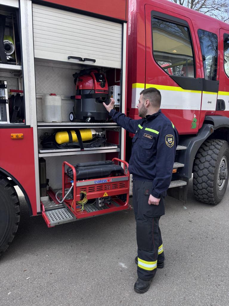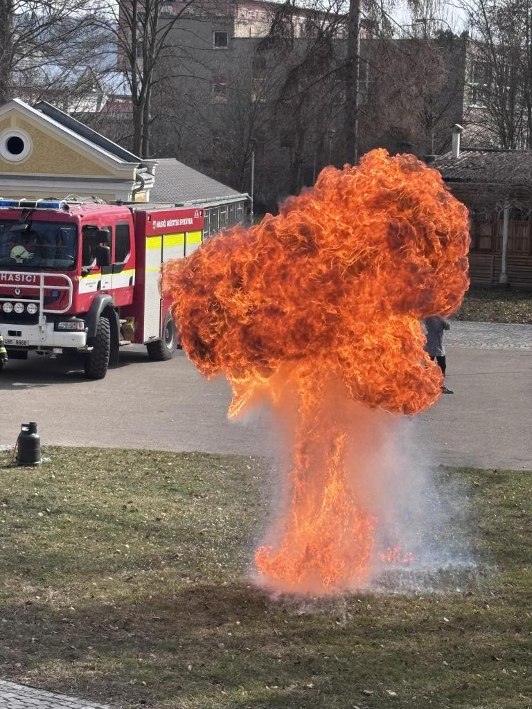 Na závěr jsme se přesunuli do parku, kde hasiči předvedli praktickou ukázku hašení zapáleného oleje. Připomněli přitom důležité pravidlo – na hořící olej se nikdy nesmí použít voda, protože by mohlo dojít k prudkému rozšíření požáru.