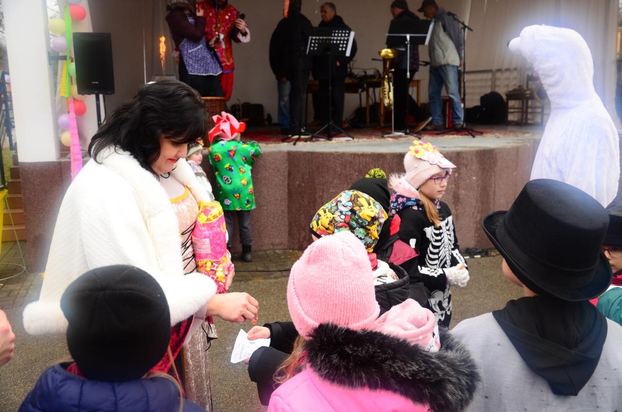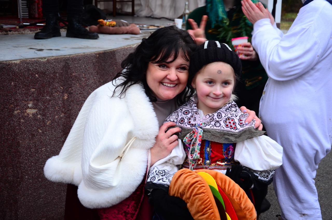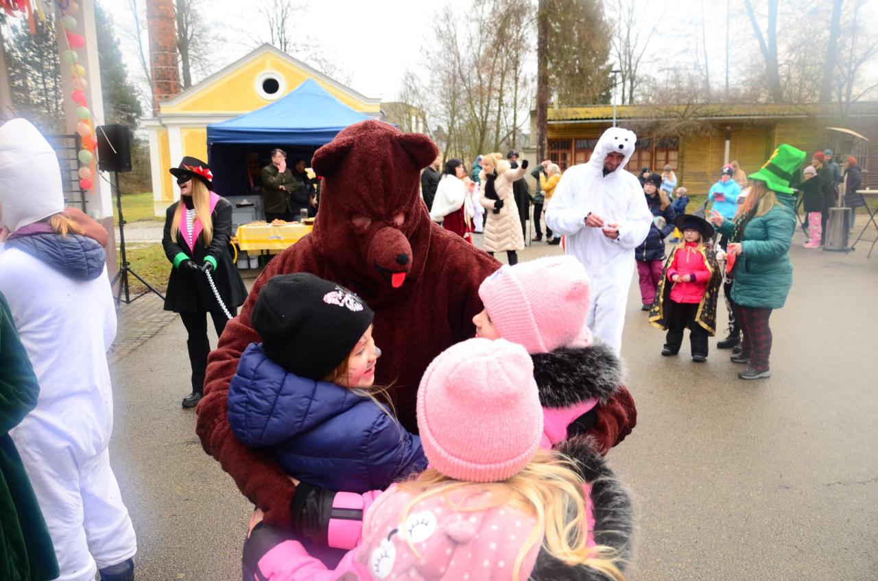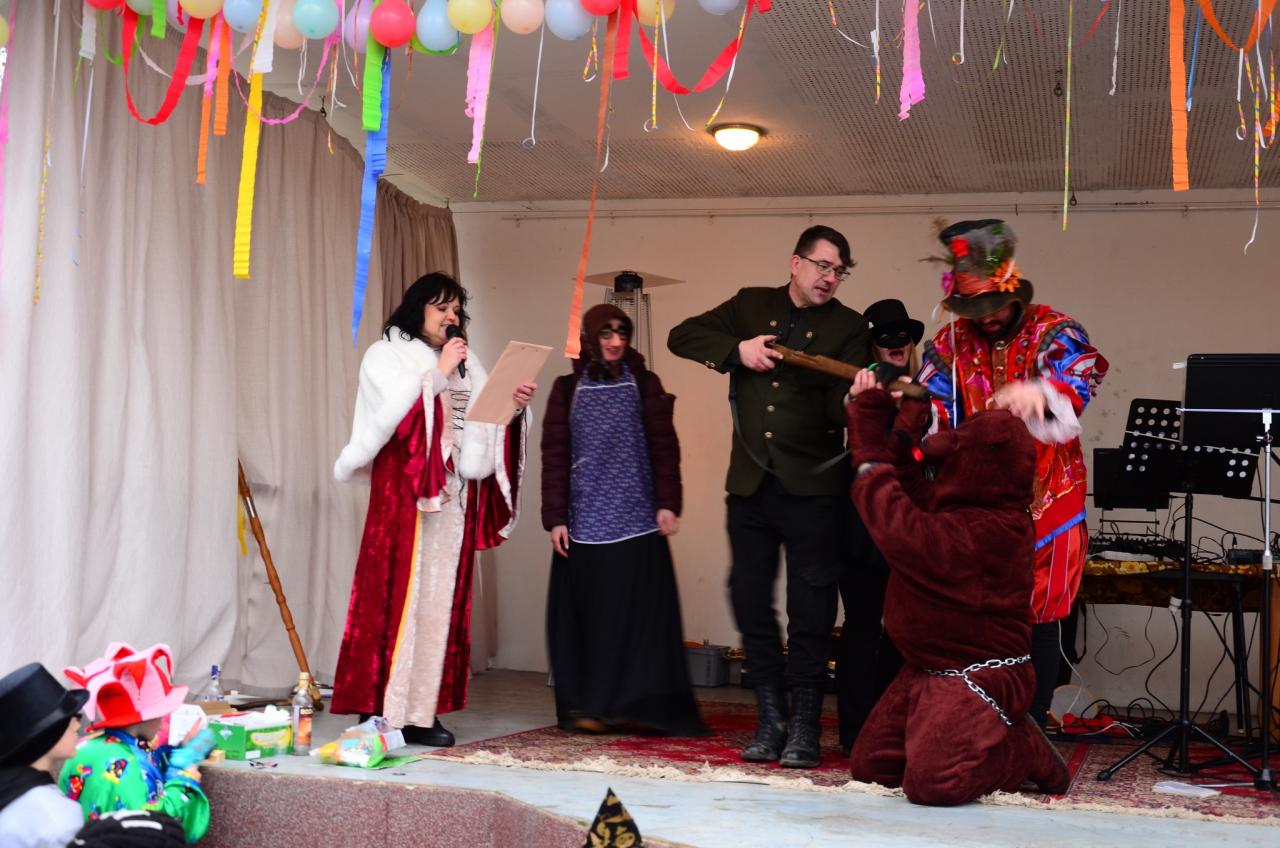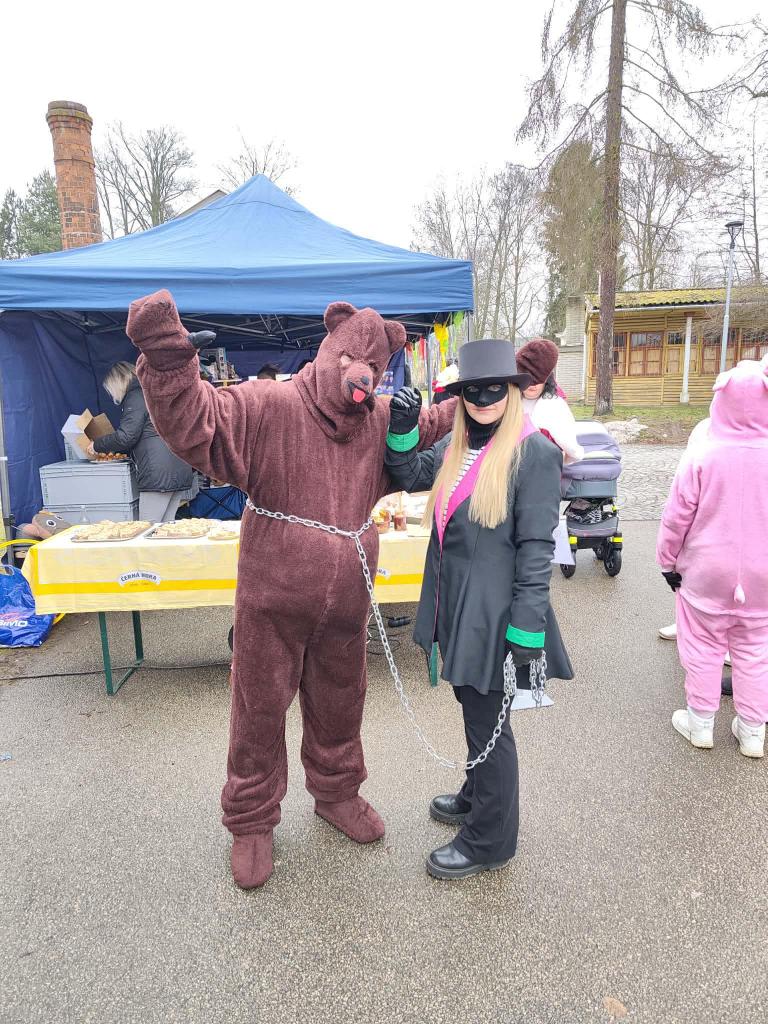 Nejpovolanější maškary – Strakatý, medvěd a jeho medvědářka – rozhýbali celý park a přinesli štěstí a plodnost polím, zahradám i manželstvím. Paní starostka zahájila medvědí taneční výzvu a tím daly maškary masopustu zelenou.