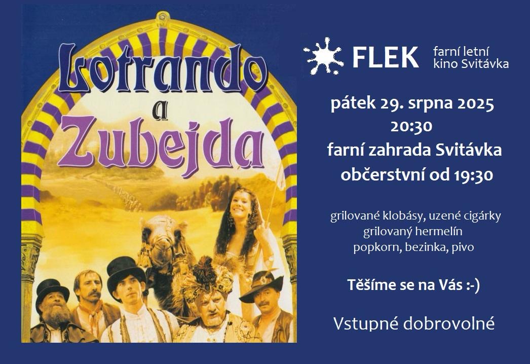 Farní společenství Svitávka vás srdečně zve do letního kina, které se bude konat v pátek 29.srpna ve 20:30 hodin na farní zahradě. Promítáme českou pohádku Lotrando a Zubejda. Občerstvení pro vás bude připraveno hodinu před začátkem filmu. Vstupné je dobrovolné. Těšíme se na vás!