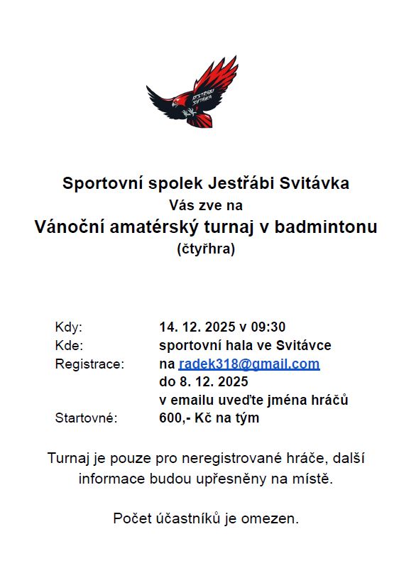 Sportovní spolek Jestřábi Svitávka pořádá Vánoční amatérský turnaj v badmintonu, který se uskuteční 14. prosince 2025 od 09:30 ve sportovní hale ve Svitávce. Turnaj je určen pro čtyřhry a je otevřen pouze pro neregistrované hráče. Registrace probíhá do 8. prosince 2025 prostřednictvím e-mailu na adresu radek318@gmail.com. V e-mailu je nutné uvést jména všech hráčů. Startovné činí 600 Kč na tým a počet účastníků je omezen. Další informace budou poskytnuty na místě konání akce.
